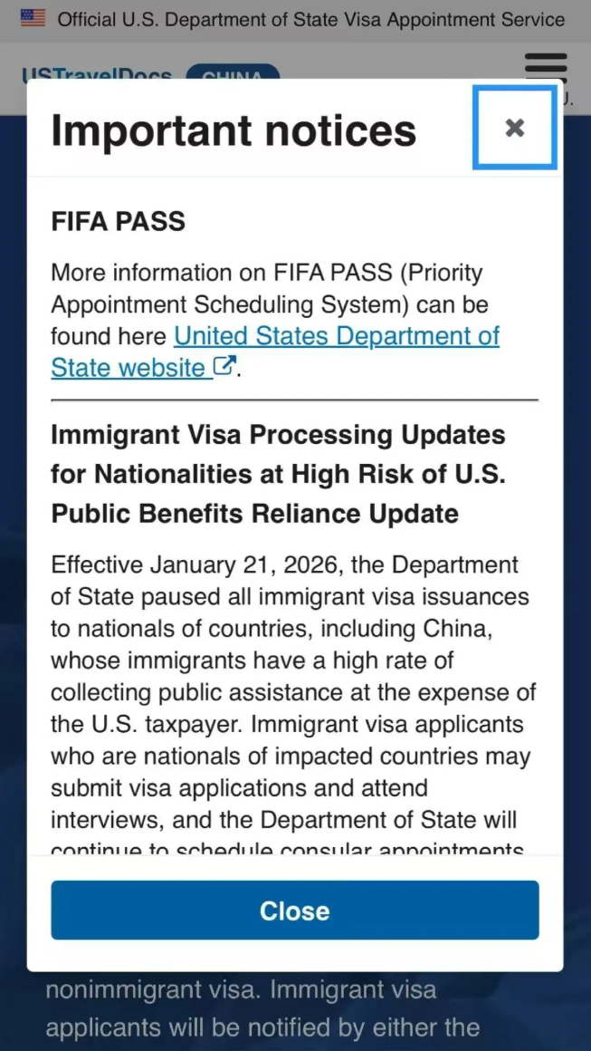 2月10日晚,一则关于 “美国暂停中国国民移民签证发放” 的消息在各大社交平台及移民圈内疯传,起因是有多位申请人在登录美国签证预约官网(USTravelDocs)时,发现弹窗明确提及 “中国” 并涉及 “公共福利” 风险暂停移民签证发放,但点击官网正文后,却未找到任何与中国相关的政策说明。