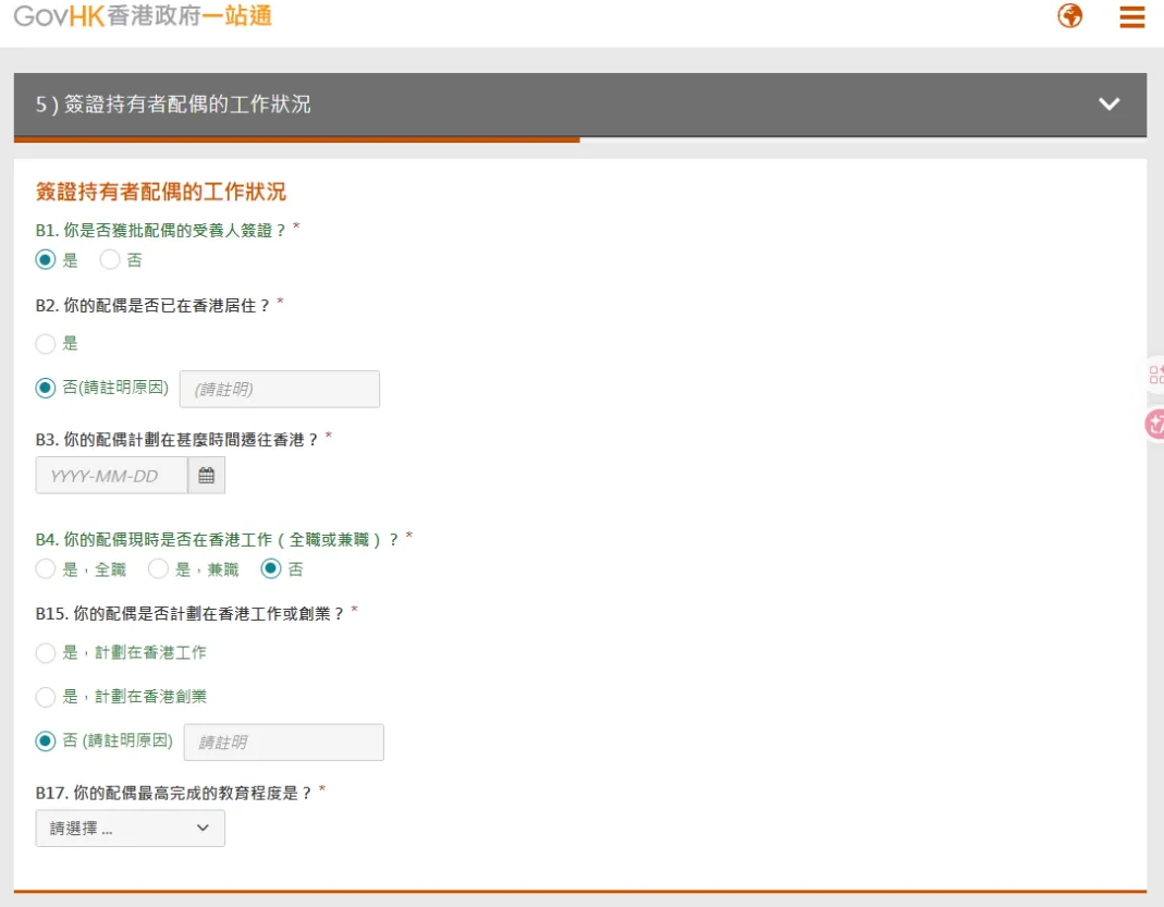 - 配偶部分(若持有受养人签证):需完整填写工作状态(就业 / 求职 / 无业)、所属行业、职位、收入水平、公司名称及地址、学历、是否在港居住、求职时长等,信息需真实可追溯,避免虚构就业情况。