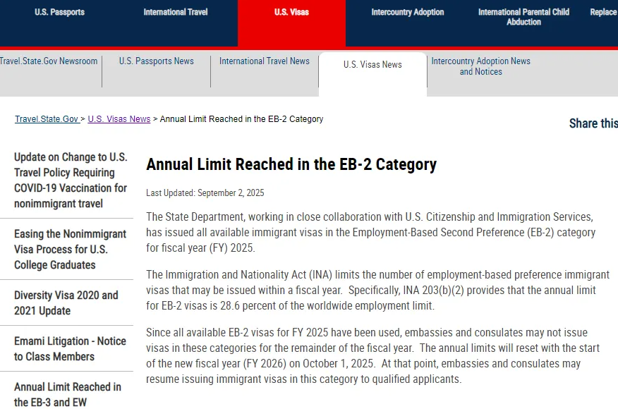 当地时间9月2日,美国国务院签证办公室正式确认,2025财年职业移民EB-2类别的所有签证配额已被全部使用完毕。