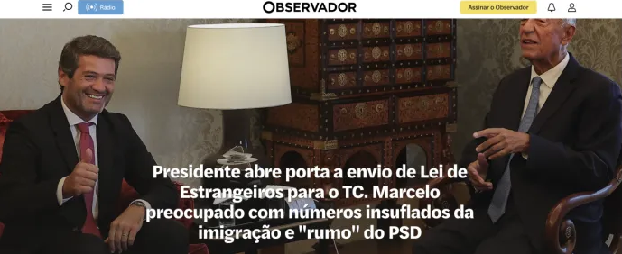 “我99.9%确信,葡萄牙总统会把国民议会批准的新外国人法提交宪法法院。”Chega主席安德烈·文图拉在贝伦宫与国家元首会晤后表示。该法令还将关键的法律概念委托给未来的法令——这些概念模糊或未定义,这些可能危害法律确定性,并导致歧视性或不一致的应用,他担忧移民数字虚高以及社会民主党的“修改方向”。