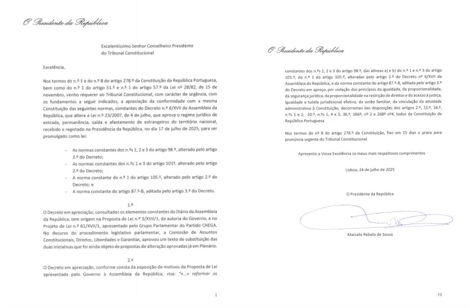 根据《葡萄牙共和国宪法》第278条第1款和第8款,以及第28/82号法律(1982年11月15日)第51条第1款和第57条第1款的规定,本人谨此请求宪法法院紧急评估以下条款的合宪性。这些条款来自议会第6/XVII号法令——该法令修订了第23/2007号法律(2007年7月4日批准关于外国人入境、停留、离境和从国家领土移除的法律制度),并于2025年7月17日由总统府接收并登记以待颁布为法律。