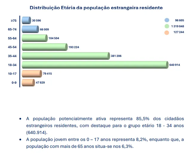 葡萄牙的外籍居民非常年轻:18~34岁的年轻人占比最大,共 640,914 人,0~17岁的青少年占 8.2%