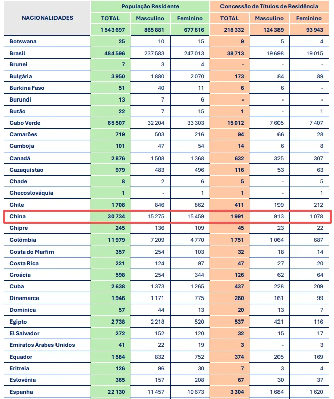 2024年,常住葡萄牙的中国公民 30,734 人,排名第七,新发放给中国公民的居留许可 1,991 份。